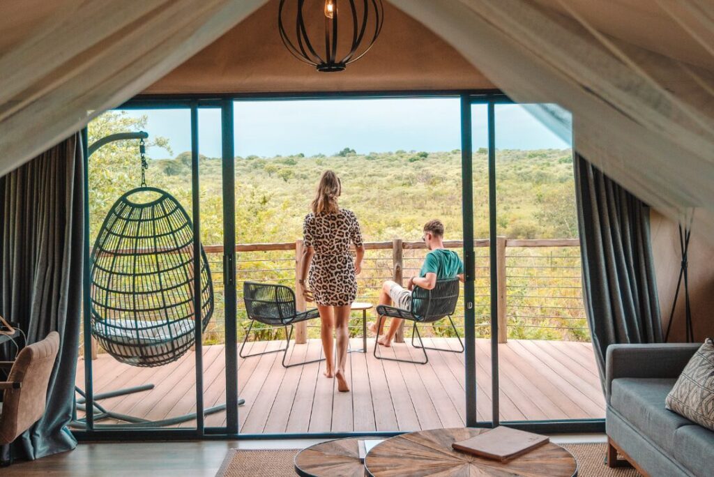Safari-style and eco-conscious design using natural timber and canvas textures blended with modern luxuries
